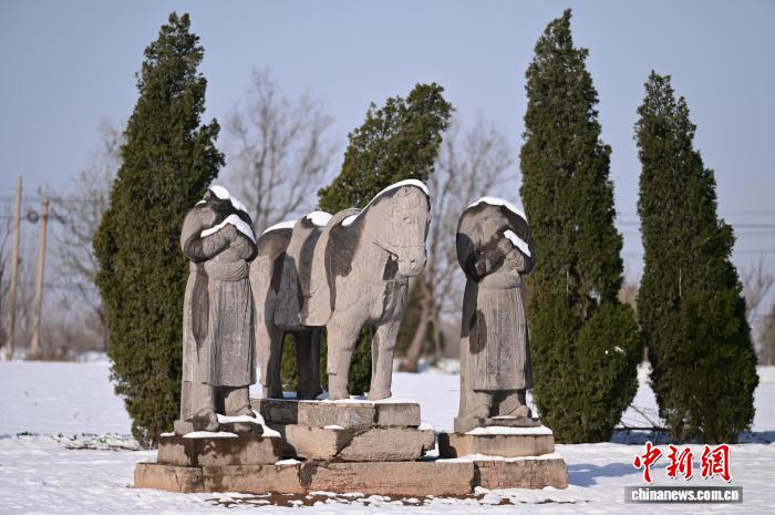 12月13日,河北巩义北宋皇陵永裕陵、永泰陵、永熙陵银拆素裹,演出小麦、始雪、石像死共框的冬季新景。图为石像死取下铁共框。邵浩铮 摄